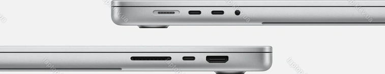 3x Thunderbolt 4 / USB4 с DisplayPort 1.4 (40Gb/s, PD-Out, сетевой разъём питания PD-In), 1x HDMI 2.1, 1x 3.5 мм аудио-разъём, 1x SD Card, 1x DC-In Apple MagSafe 3 (сетевой разъём)