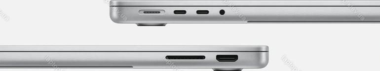 2x Thunderbolt 4 / USB4 с DisplayPort 1.4 (40Gb/s, PD-Out, сетевой разъём питания PD-In), 1x HDMI 2.1, 1x 3.5 мм аудио-разъём, 1x SD Card, 1x DC-In Apple MagSafe 3 (сетевой разъём)